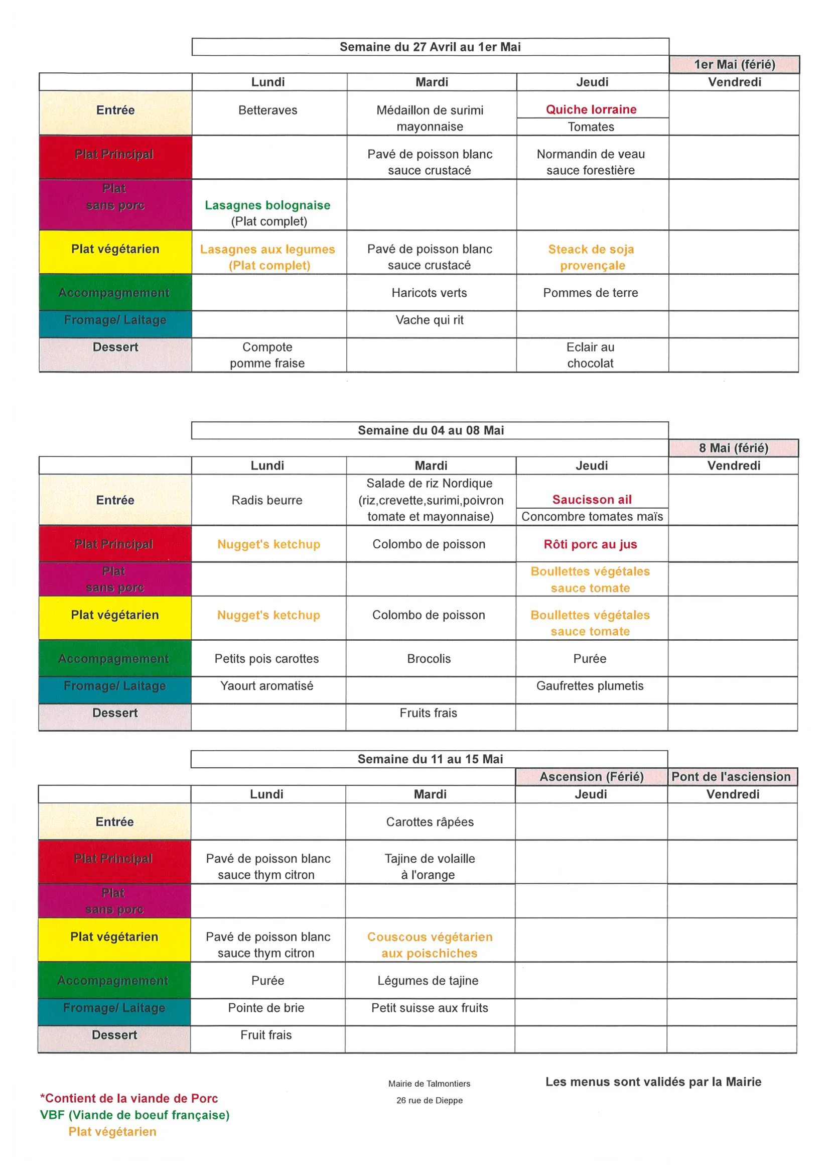 Les menus seront communiqués sur le site de la commune – sur Intramuros et affichés chaque semaine devant l’école primaire et l’école maternelle.
